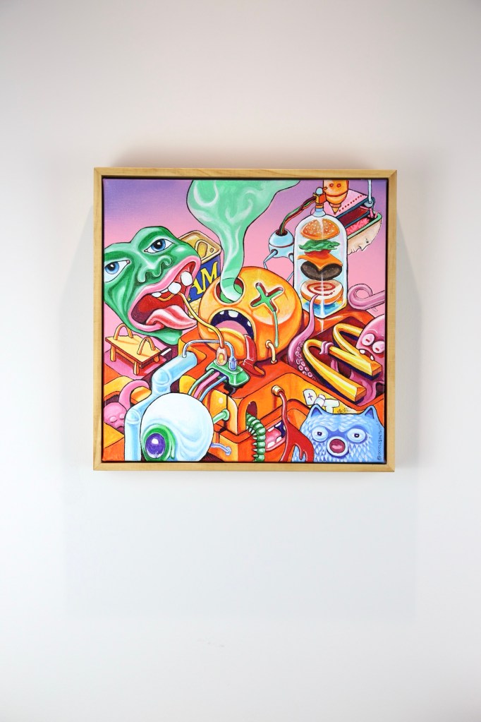Aerosol, Acrylic and Ink on canvas. Box Framed.