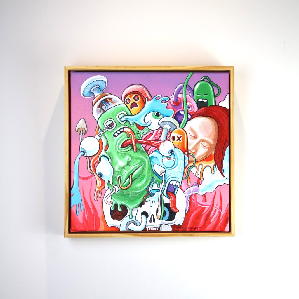 Aerosol, Acrylic and Ink on canvas. Box Framed.