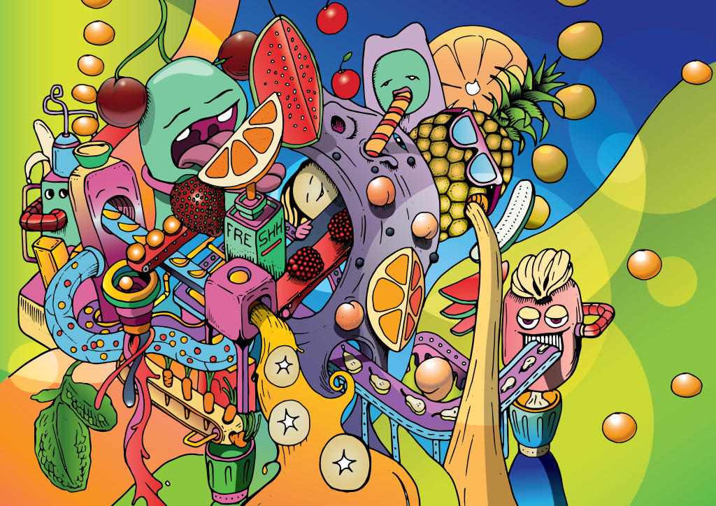 I wanted to create an in your face explosion of colour that was all about fruit but was unmistakable as a Doodles in Transit original.